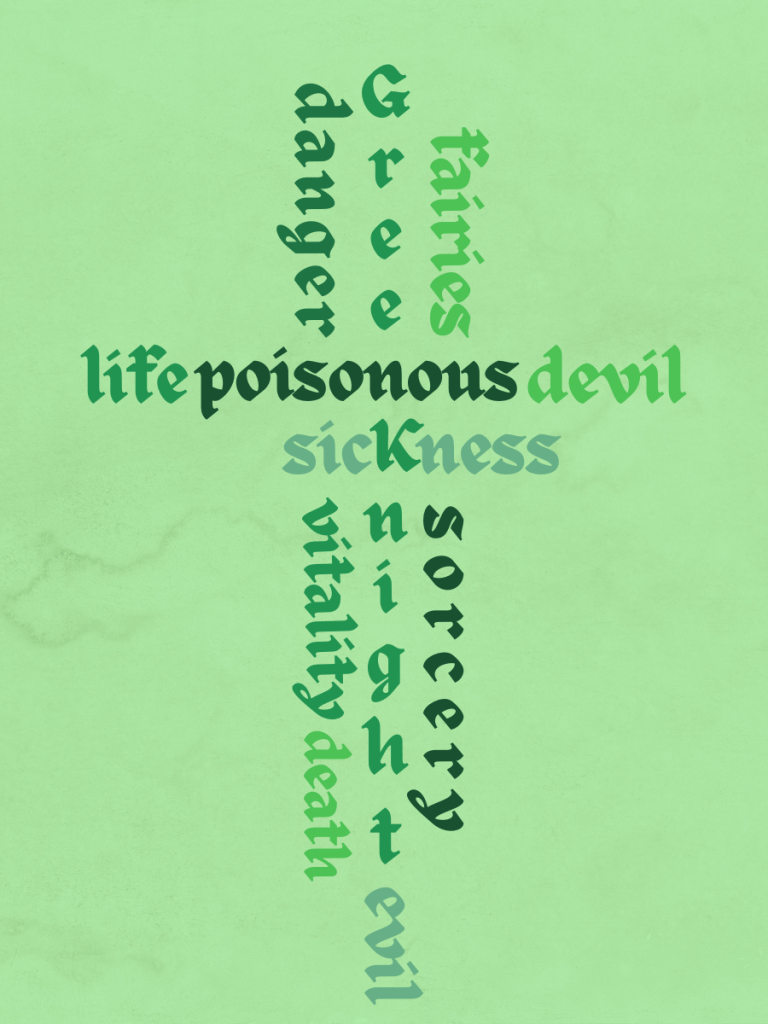 Color plays a noteworthy role in the symbolism of the green girdle, and many of the negative connotations of the color green add to the girdle’s meaning. Given the context of the poem, green represents the knight whom Gawain is seeking. This makes the belt a symbol of the Green Knight, as well as a sign of danger because Gawain associates the Green Knight with mystery and peril. In medieval times, green was also a color popularly associated with the devil and the fairy world, as Robertson mentions in his article “Why the Devil Wears Green” (471). To the poem’s medieval audience, this connection between the girdle and fairies would have represented an additional warning of danger. Green connects the girdle to the idea of illness as well. Robert Fleissner provides an example of this, writing that medieval humoral medicine associated sickness with being green (48). For example, Fleissner explains that “a ‘green lover’ could be either a bit off balance or severely ill” (48). Like the color green, the girdle embodies the idea of illness, for it weakens Gawain and reveals to Gawain “the frailty of his flesh” (Sir Gawain 2435). Another meaning green symbolizes is death, most likely because of the color’s connection to illness and the fact that plants popularly known for their evergreen nature are often toxic. As an example, medical doctors Evens and Stellpflug claim that mistletoe’s green leaves, in spite of medieval beliefs, are actually poisonous. Like its green color, the girdle represents death too, for Gawain is wounded because he takes it and experiences a metaphorical death when he meets the Green Knight at the end of the story. A final meaning of the color green that relates to Sir Gawain and the Green Knight is fear. The Greek prefix chloro- means green, and author Helen King writes, “The ancient Greek adjective chloros was used for the colour appropriate to fear” (375). The girdle reflects this connotation and is a symbol of fear because Gawain agrees to take the belt out of fear for his life. Some might argue that Gawain accepts the belt out of caution, not because he is afraid, but Gawain himself admits at the end of the poem that he takes the girdle because of his cowardice (Sir Gawain 2374).